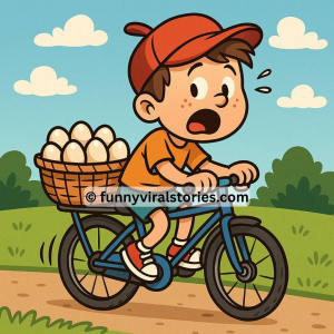 A boy was cycling with a basket of eggs