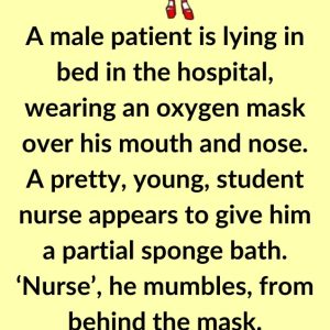A male patient is lying in bed in the hospital, wearing an oxygen mask over his mouth and nose. A pretty, young, student nurse appears to give…