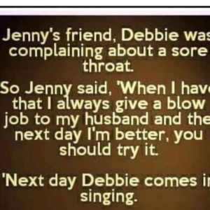 Jenny’s friend, Debbie was complaining about a sore throat. So Jenny said.‘When I have that I always give a blow job to my husband and the next day…