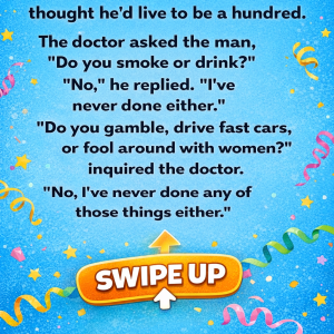 The doctor asked the man, “Do you smoke or drink?” “No,” he replied. “I’ve never done either.” “Do you gamble, drive fast cars, or fool around with…
