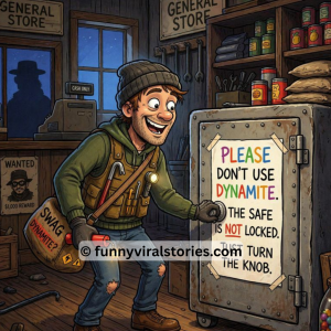 A burglar decided to rob the safe in a store. On the safe door, he was very pleased to find a note reading: “Please don’t use dynamite….
