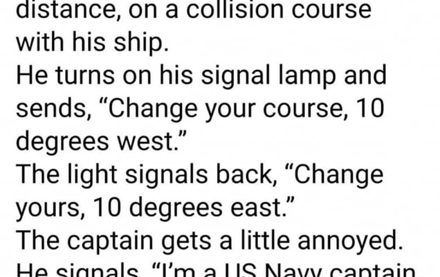 He signals, “I’m a US Navy captain. You must change your course, sir.” The light signals back, “I’m a Seaman First Class. You must change your course, sir.”