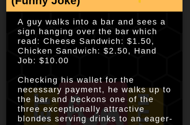 A guy walks into a bar (Funny Joke), A guy walks into a bar and sees a sign hanging over the bar which read: Cheese Sandwich: $1.50, Chicken Sandwich: $2.50, Hand Job: $10.00 Checking his wallet for the necessary payment.