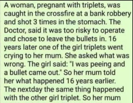 The girl said: “I was peeing and a bullet came out.” So her mum told her what happened 16 years earlier. The nextday the same thing happened with the other girl triplet. So her mum with the other girl triplet. So her mum told her the same story about the bank robbery.
