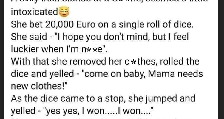 A s**y Irish blonde at a C**ino, seemed a little intoxicated, She bet 20,000 Euro on a single roll of dice. She said – “I hope you don’t mind, but I feel luckier when I’m n**e”. With that she removed her clothes, rolled the dice and yelled – “come on baby, Mama needs new clothes!”