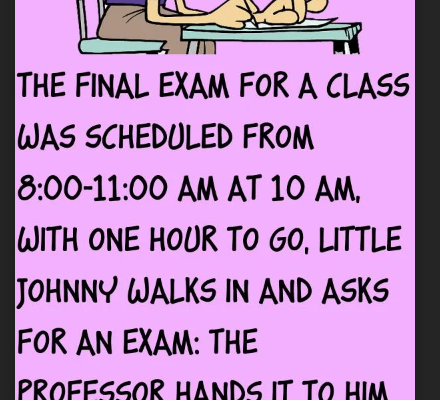 The final exam for a class was scheduled from 8:00-11:00 AM At 10 AM, with one hour to go, Little Johnny walks in and asks for an exam: The professor hands it to him but informs him that he still must finish within the hour or he will receive a zero and fail the course.