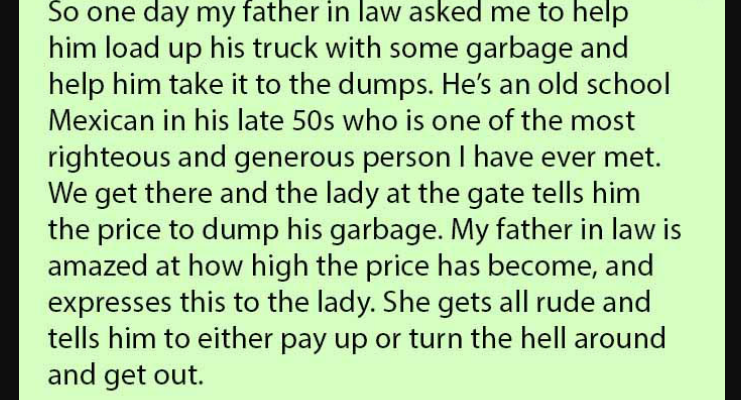 He’s an old school Mexican in his late 50s who is one of the most righteous and generous person I have ever met. We get there and the lady at the gate tells him the price to dump his garbage.
