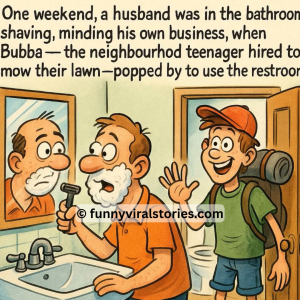 One weekend, a husband was in the bathroom shaving, minding his own business, when Bubba—the neighborhood teenager hired to mow their lawn—popped by to use the restroom….