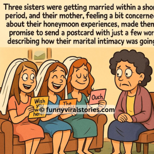 Three sisters were getting married within a short period, and their mother, feeling a bit concerned about their honeymoon experiences, made them promise to send a postcard…