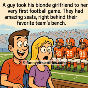 A guy took his blonde girlfriend to her very first football game. They had amazing seats, right behind their favorite team’s bench. After the game, he asked…