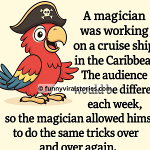 A magician was working on a cruise ship in the Caribbean.The audience was different each week, so the magician did the same tricks over and over again….