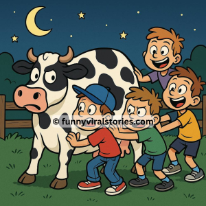 A bunch of boys decide to go cow-tipping…They go up to the fence and they are all standing there. They all point out the closest cow and…
