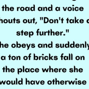 A woman is walking on the road and a voice shouts out, “Don’t take a step further. She obeys and suddenly a ton of bricks fall on…