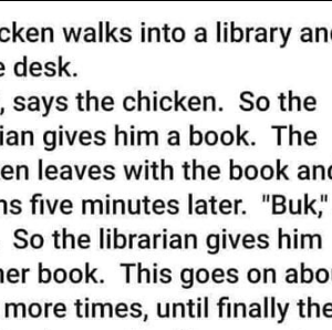 A chicken walks into a library and up to the desk. “Buk”, says the chicken. So the librarian gives him a book. The chicken leaves with the…