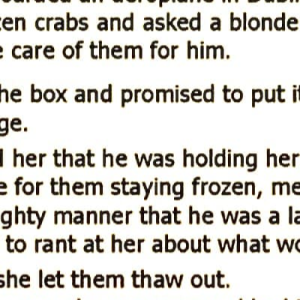 A lawyer boarded an airplane in Dublin with a box of frozen crabs and asked a blonde stewardess to take care of them for him. She took…