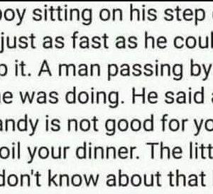 Little boy sitting on his step eating candy just as fast as he could unwrap it. A man passing by saw what he was doing. He said…
