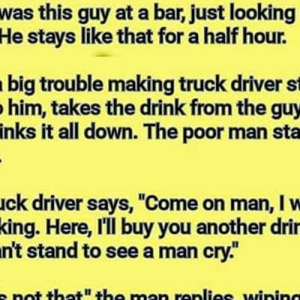 There was this guy at a bar, just looking at his drink. He stays like that for a half hour. Then a big trouble-making truck driver steps…