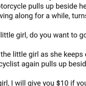 A Little 10-year-old girl was walking home, alone, from school one day, when a big man on a black motorcycle pulled up beside her. After following along…