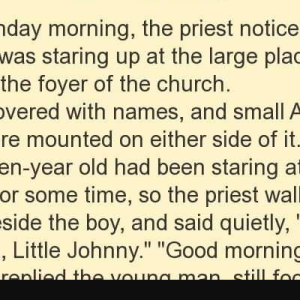One Sunday morning, the priest noticed Little Johnny staring up at the large plaque that hung in the foyer of the church.It was covered with names, and…