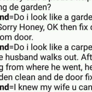 Wife Honey can u please help me clean de garden? Husband – I look like a gardener? Wife-Sorry Honey, OK then fix de bathroom door.Husband-Do i look…