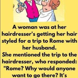 A woman enters a hair salon and mentions she and her husband will bi taking a trip to Rome to the hairdresser. “Rome? Why would anyone want…