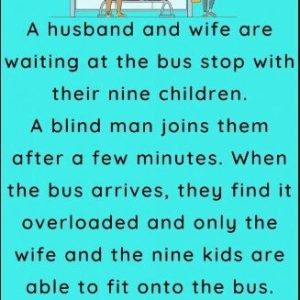 A husband and wife are waiting at the bus stop with their nine children. A blind man joins them after a few minutes. When the bus arrives….