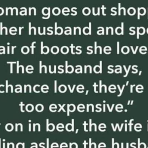 A woman goes out shopping with her husband and spots a pair of boots she loves. The husband says, “No chance love, they’re way too expensive. “Later…
