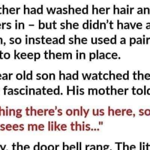 The mother had washed her hair and just put rollers in – but she didn’t have a hair net for them, so instead she used a pair…