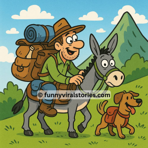 A man prepares his donkey and dog for a long journey up a mountain. He places a pack straddle on the donkey’s back and fills everything to…