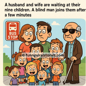 A husband and wife are waiting at the bus stop with their nine children. A blind man joins them after a few minutes. When the bus arrives….