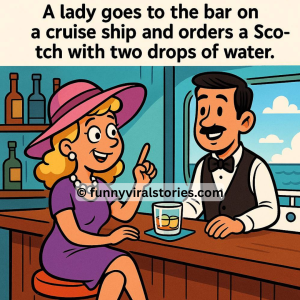 A lady goes to the bar on a cruise ship and orders a Scotch with two drops of water. As the bartender gives her the drink she…