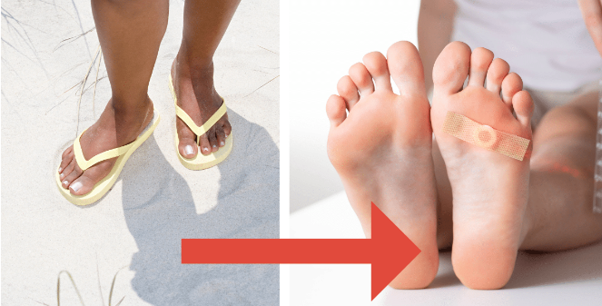 The sole attachment point for flip-flops is the side straps, which constantly rub against the skin, generating painful blisters that can turn into open sores and lead to bacterial infections.
