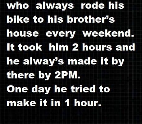 There was an old man who always rode his bike to his brother’s house every weekend. It took him 2 hours and he alway’s made it by there by 2PM.