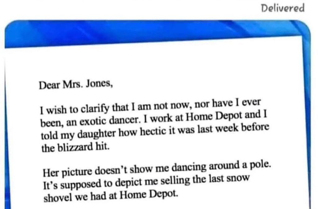 I wish to clarify that I am not now, nor have I ever been, an exotic dancer. I work at Home Depot and I told my daughter how hectic it was last week before the blizzard hit.