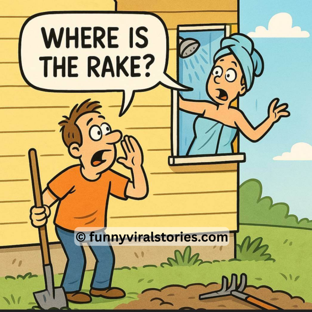 He realized that he couldn’t find the rake and yelled up to his wife. “Where is the rake?”